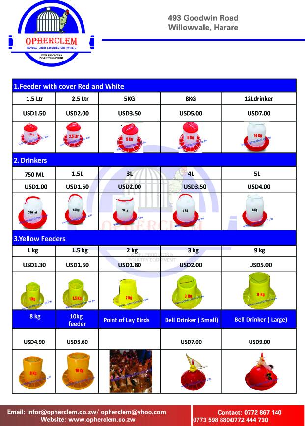 750ml .........$1.00 1.5 litre.........$1.50 3 litres..........$2.00 5 litres..........$3.50 10litres.........$4.50 Nipple drinkers with cups $0.90 Without cups...$0.75 Rabbit nipples.$0.90 Contacts: whatsapp or call on 0772 867140 sales 0772 444730. / 0773 598880 493 Goodwin Road, industry opposite. Eaglesvale High School