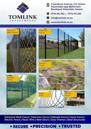 Our products include:- • Diamond Mesh Fence • Clearview Fence • Palisade Fence • Game Fence • Electric Fence • Razor Wire • Steel Doors • Door Frames • Steel Structures Contact us on 0781 833793